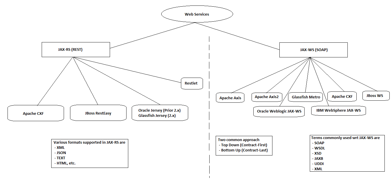 ? As principais implementações disponíveis para essa essa especificação são: Apache CXF, JAX-WS, Apache Axis2 e Oracle WebLogic.